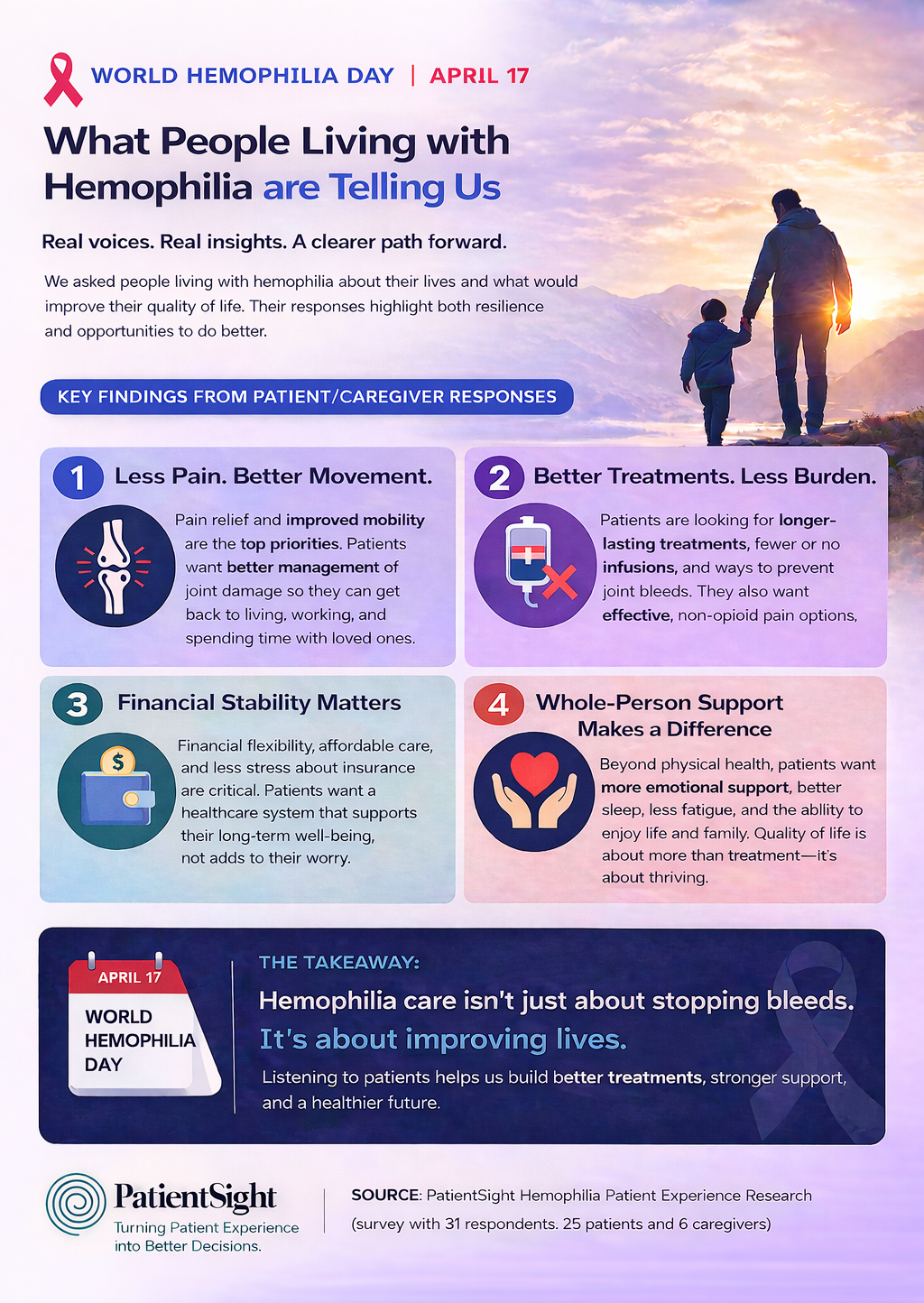 In recognition of World Hemophilia Day (April 17th), PatientSight is sharing findings from open-ended survey responses that shed light on the lifestyles and experience of people living with hemophilia and ways many of them would like to see things improve.